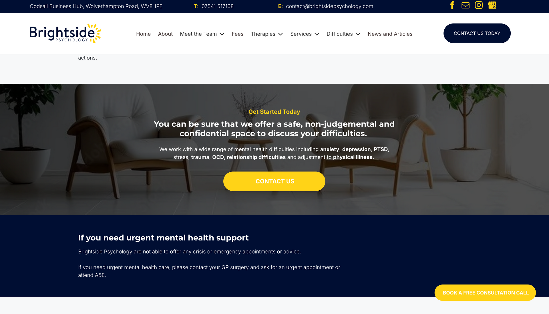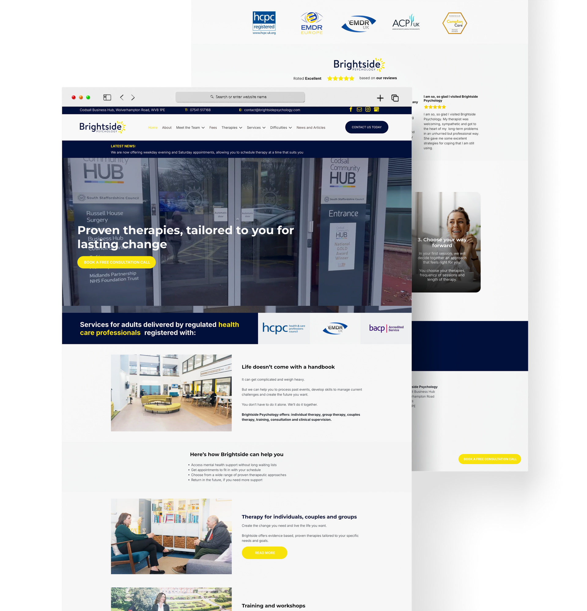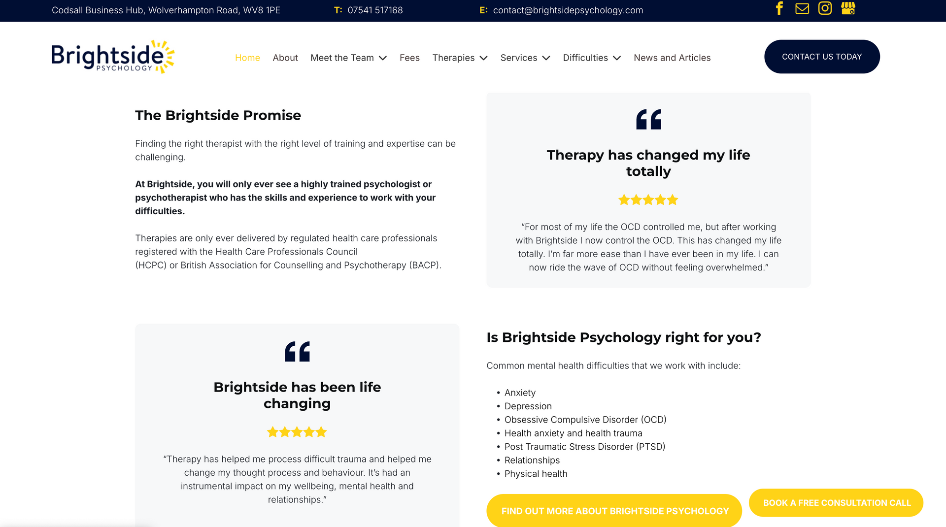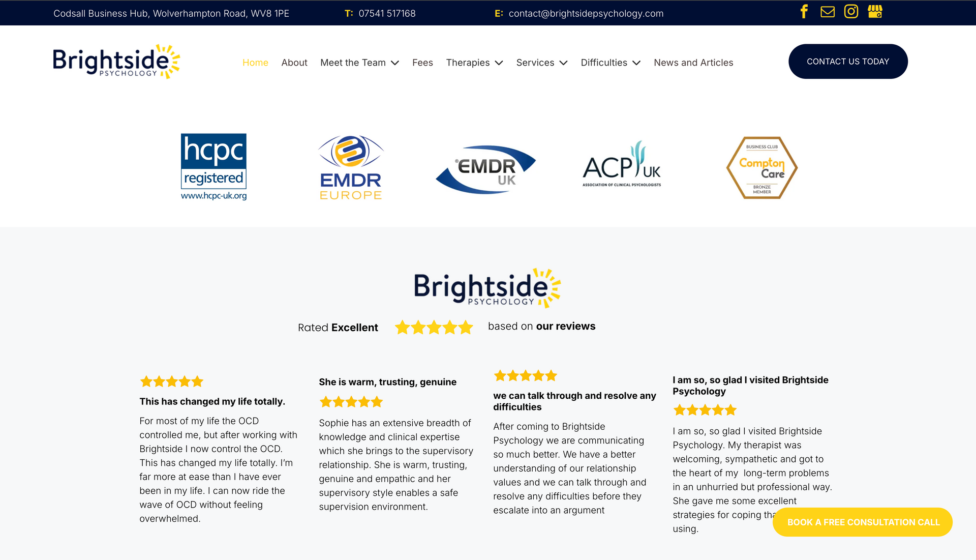 Brightside psychology offers proven therapies for a variety of difficulties including Anxiety, Depression, OCD as well as more general therapies for issues surrounding parenthood and relationships. Given the sensitive nature of the services, it was important to ensure the tone of the website was open and inviting as well as professional. Due to the medical background, all certificates and accreditations were visible to users.