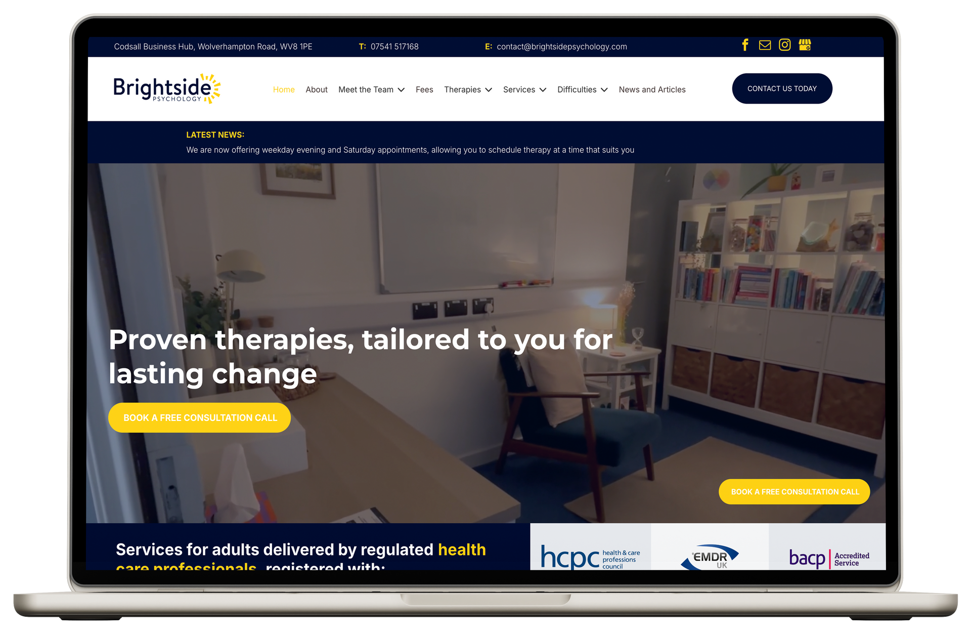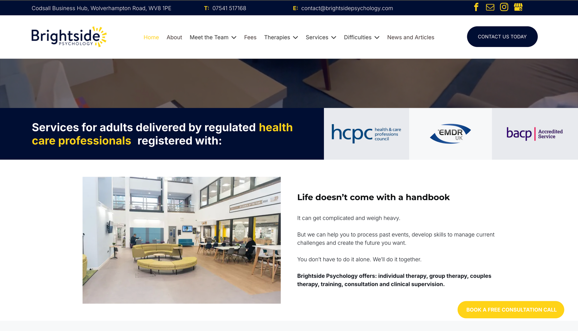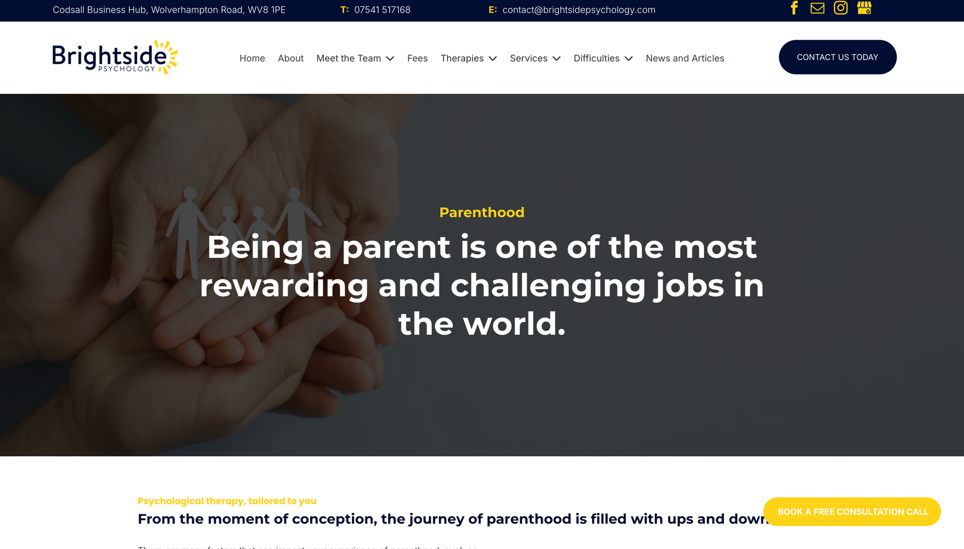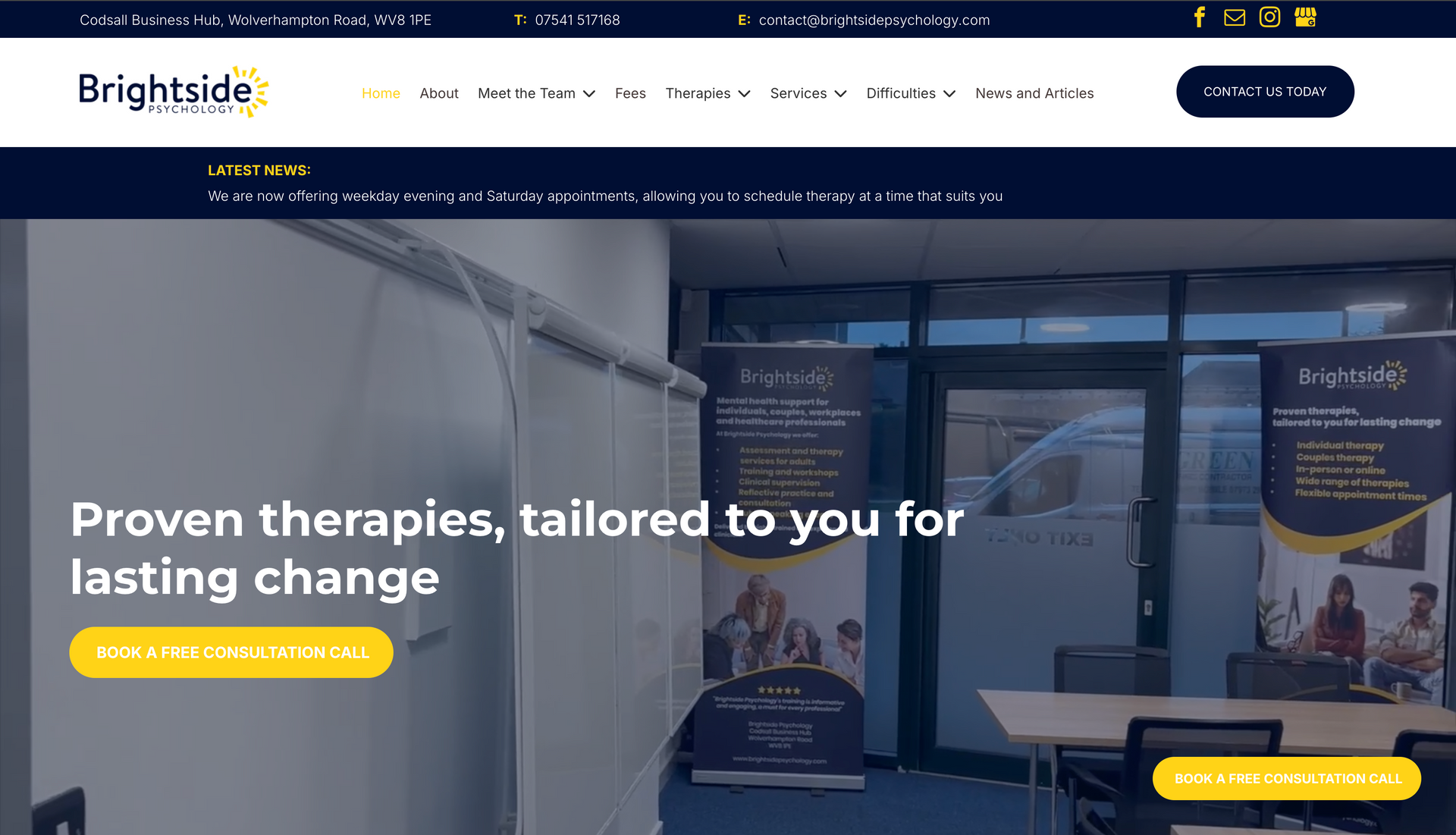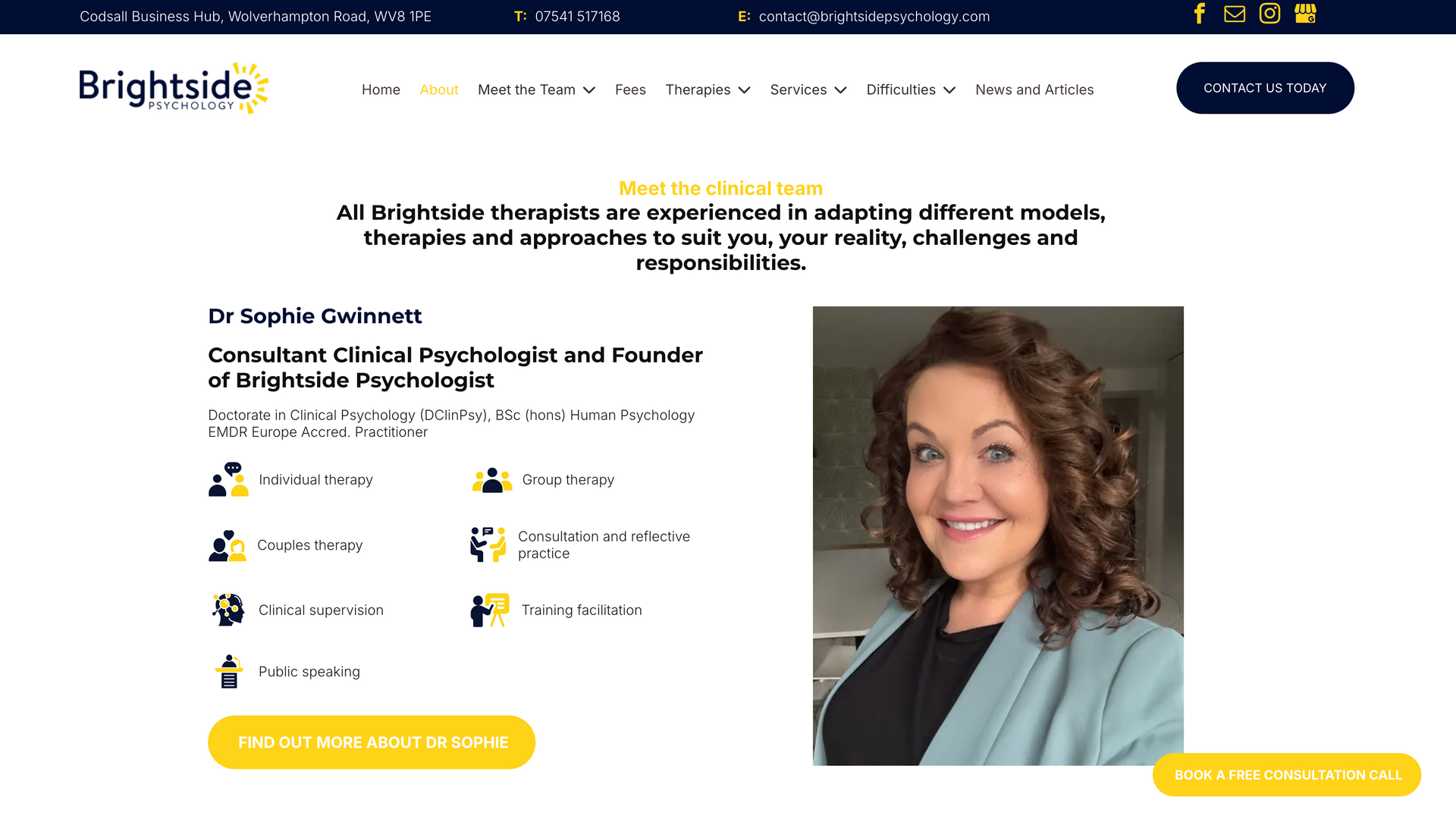 Brightside psychology offers proven therapies for a variety of difficulties including Anxiety, Depression, OCD as well as more general therapies for issues surrounding parenthood and relationships. Given the sensitive nature of the services, it was important to ensure the tone of the website was open and inviting as well as professional. Due to the medical background, all certificates and accreditations were visible to users.