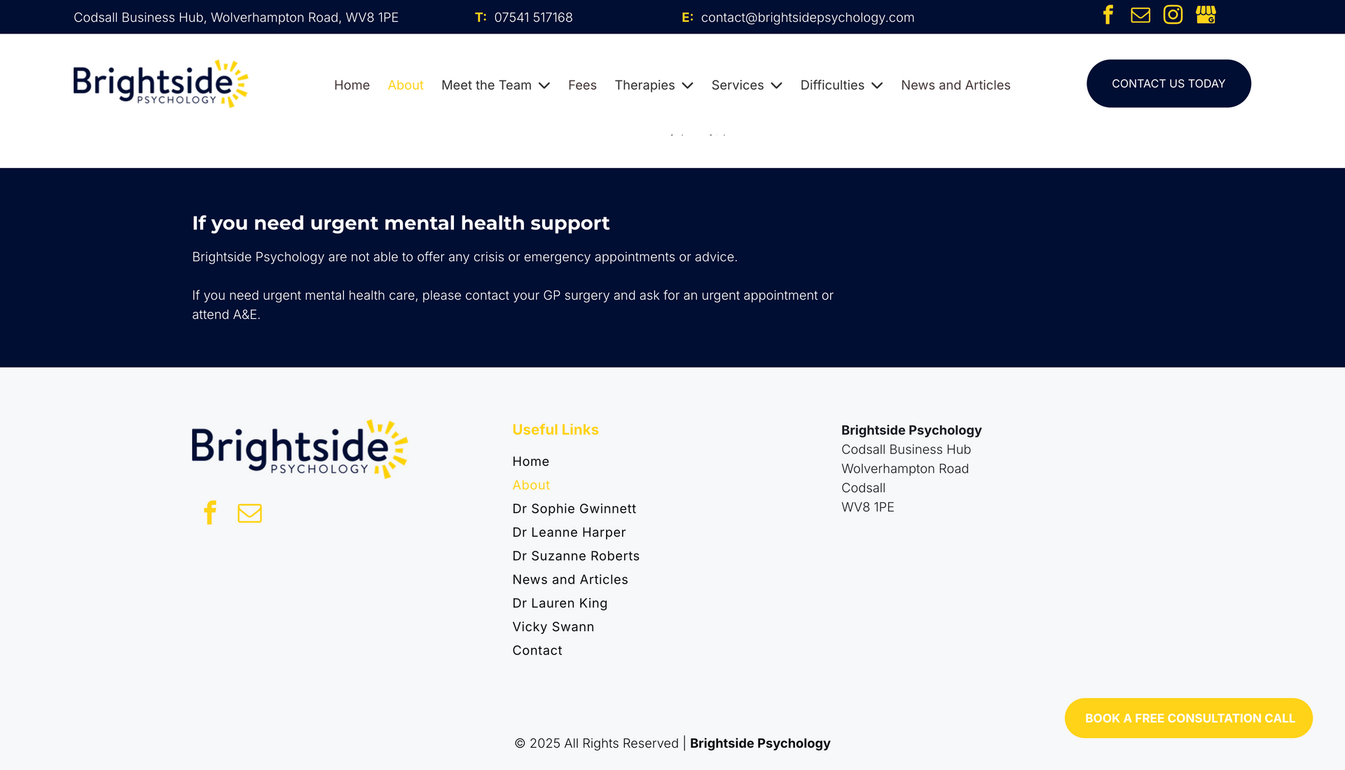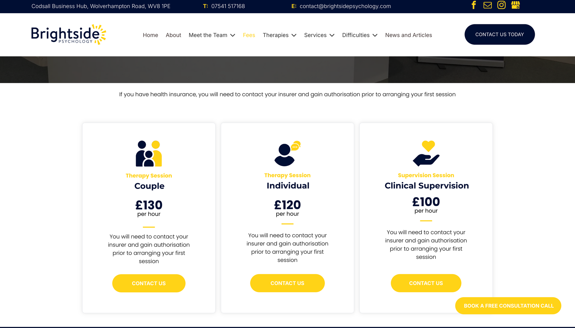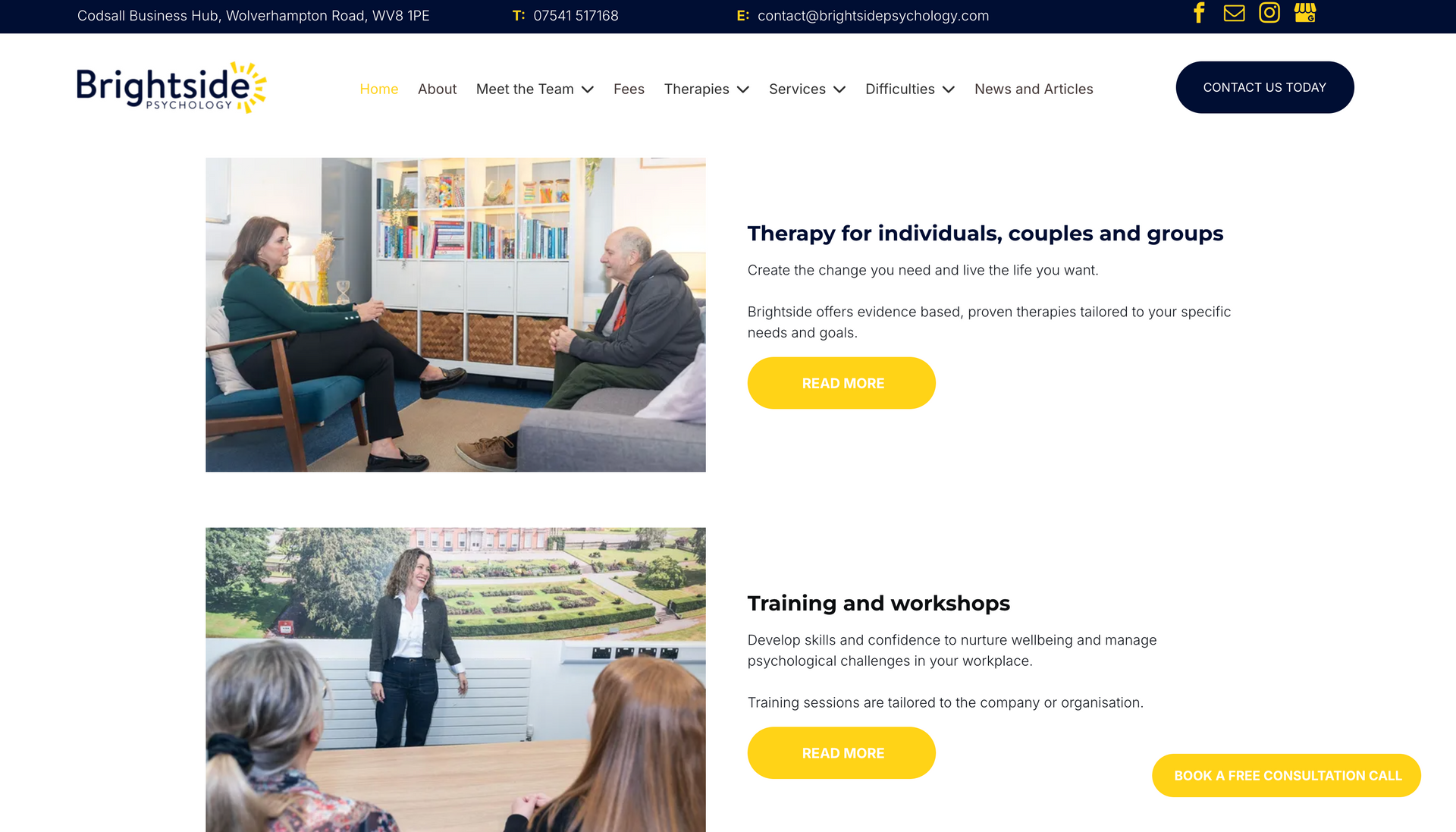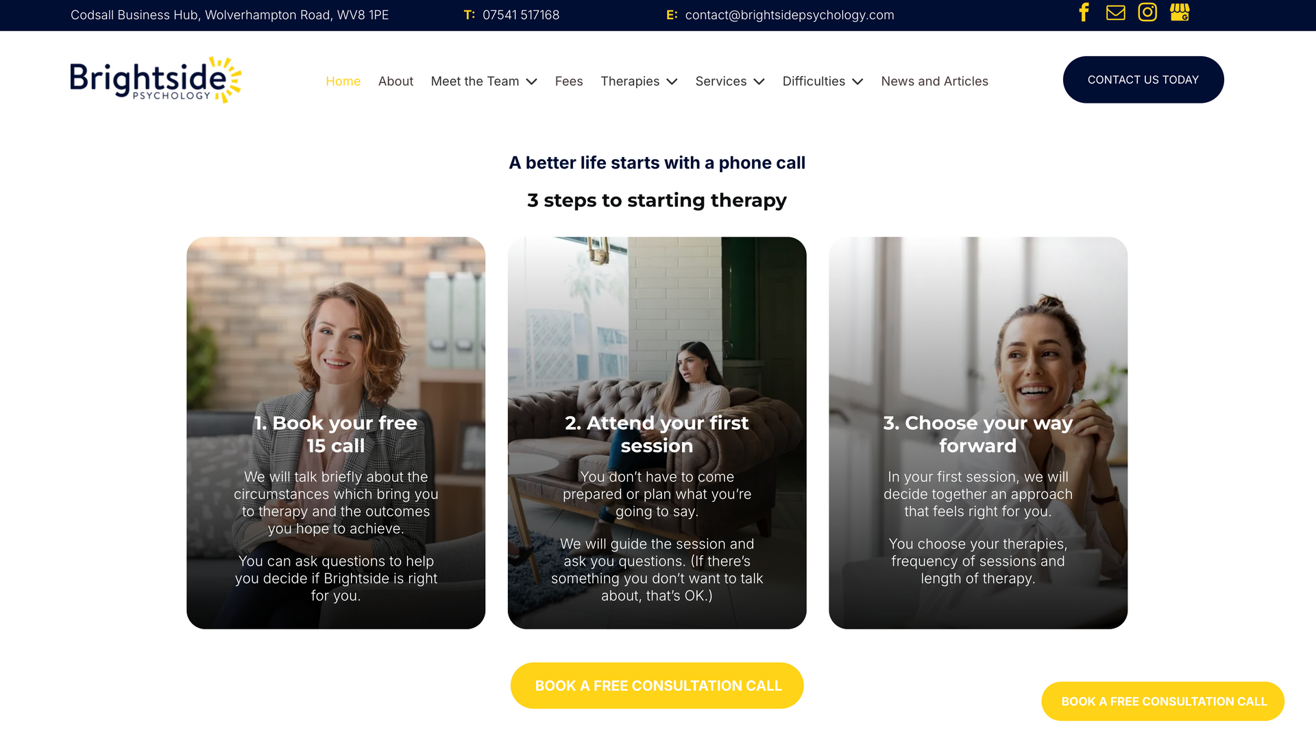 Brightside psychology offers proven therapies for a variety of difficulties including Anxiety, Depression, OCD as well as more general therapies for issues surrounding parenthood and relationships. Given the sensitive nature of the services, it was important to ensure the tone of the website was open and inviting as well as professional. Due to the medical background, all certificates and accreditations were visible to users.