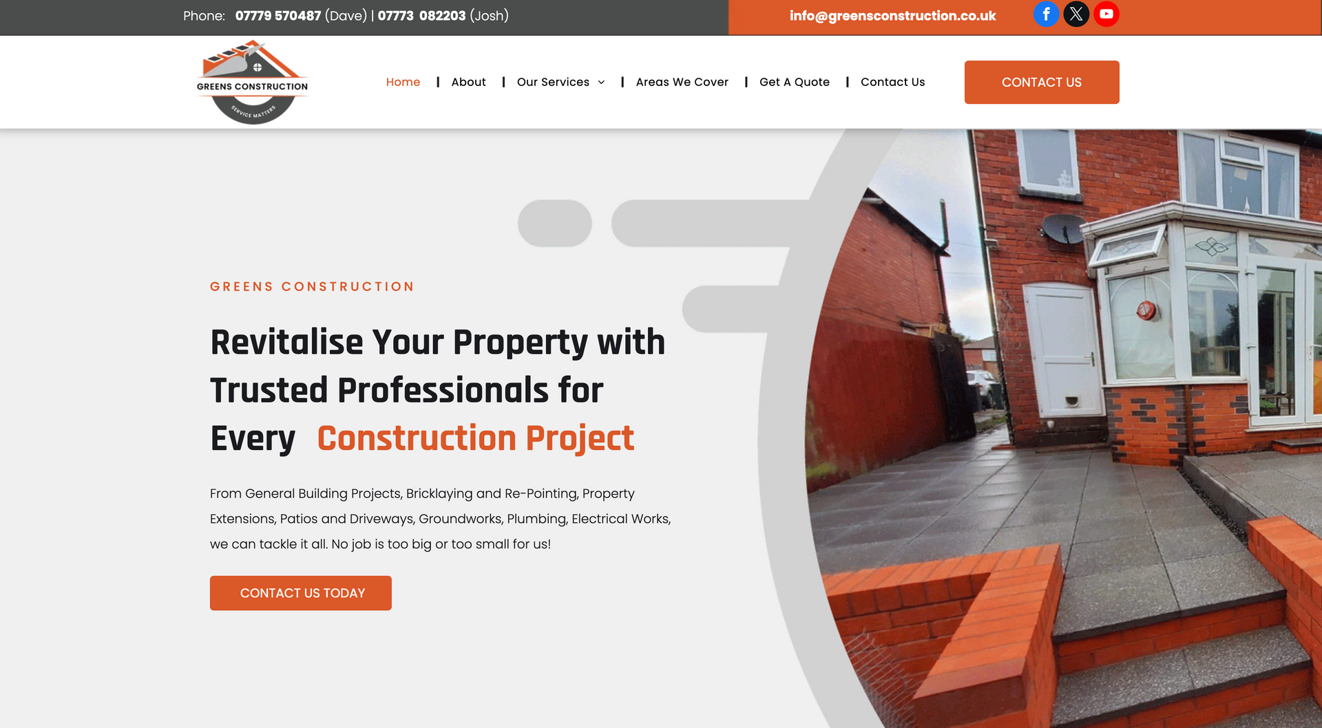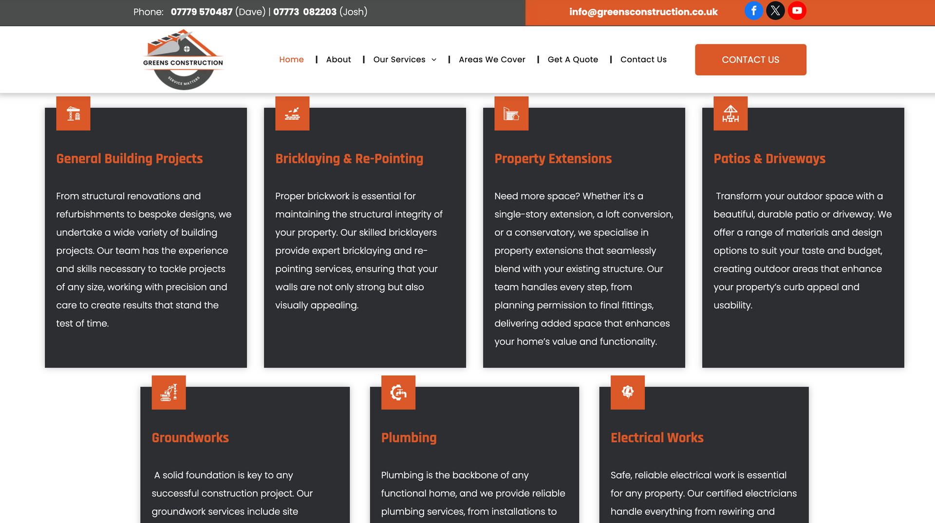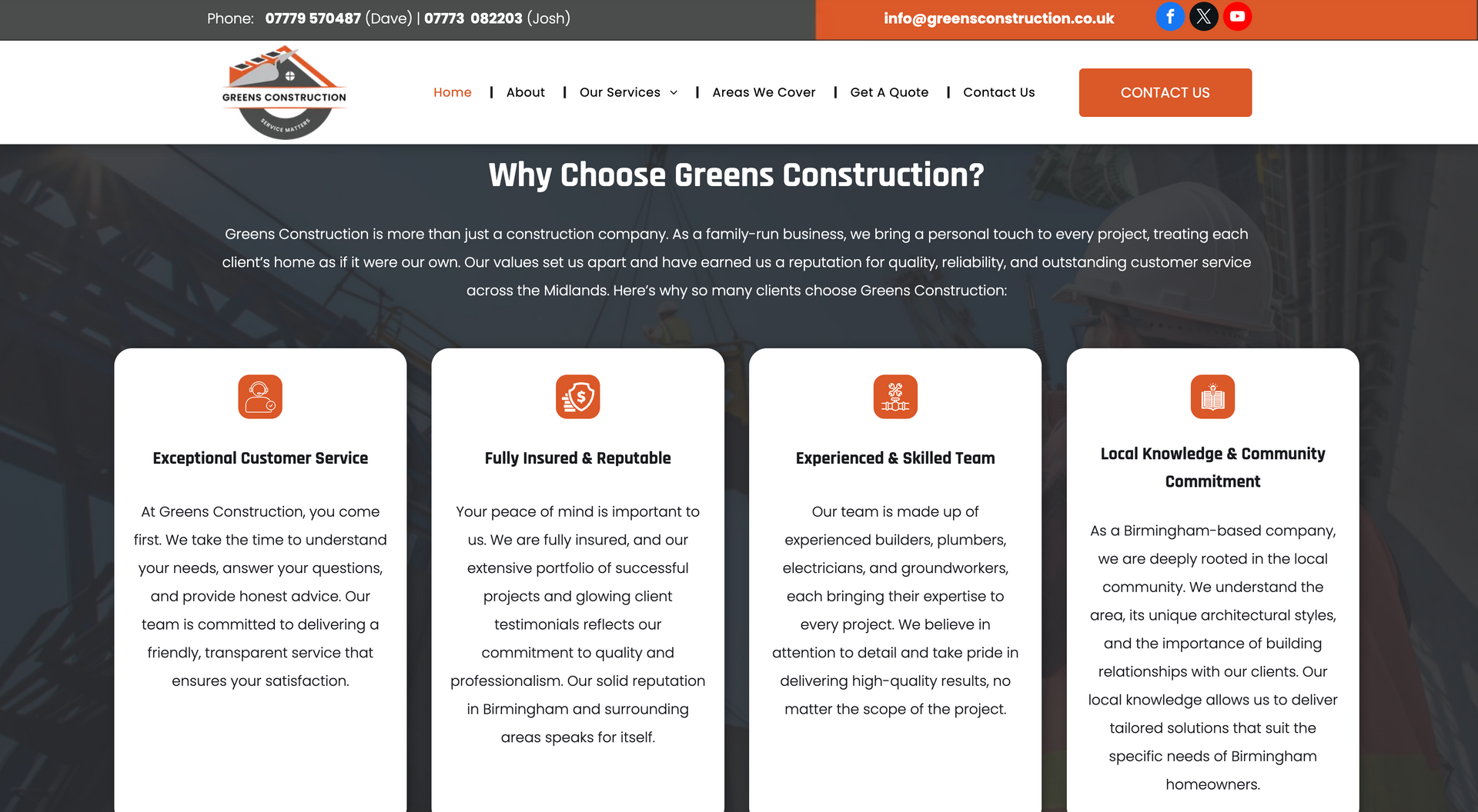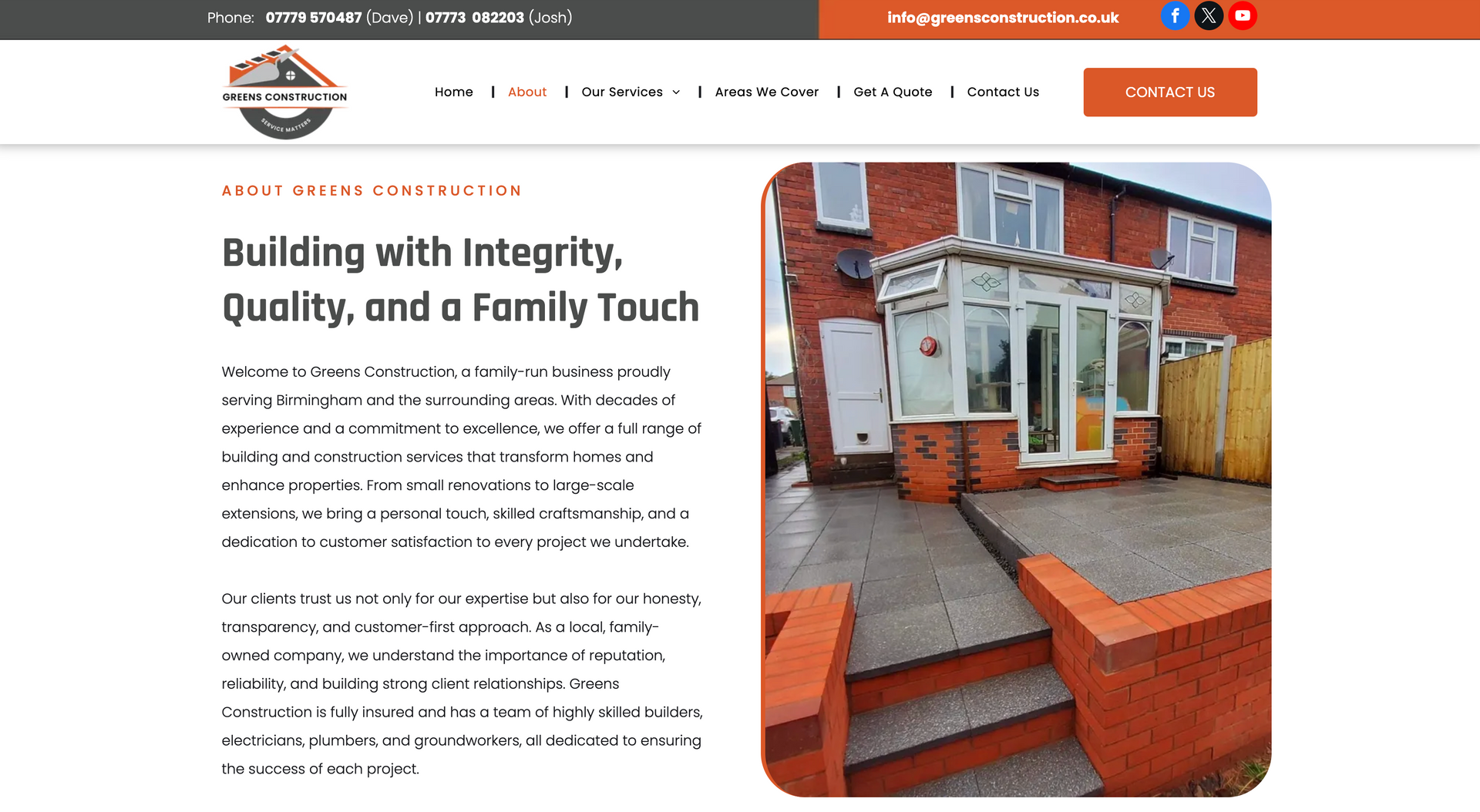 A family run business based in Birmingham, Green Construction covers everything from electrical works to patios. It was important to include a portfolio of previous works as well as showing as many customer reviews as possible to evidence the level of work and customer satisfaction of Green Construction.