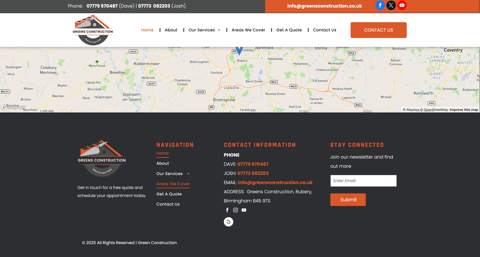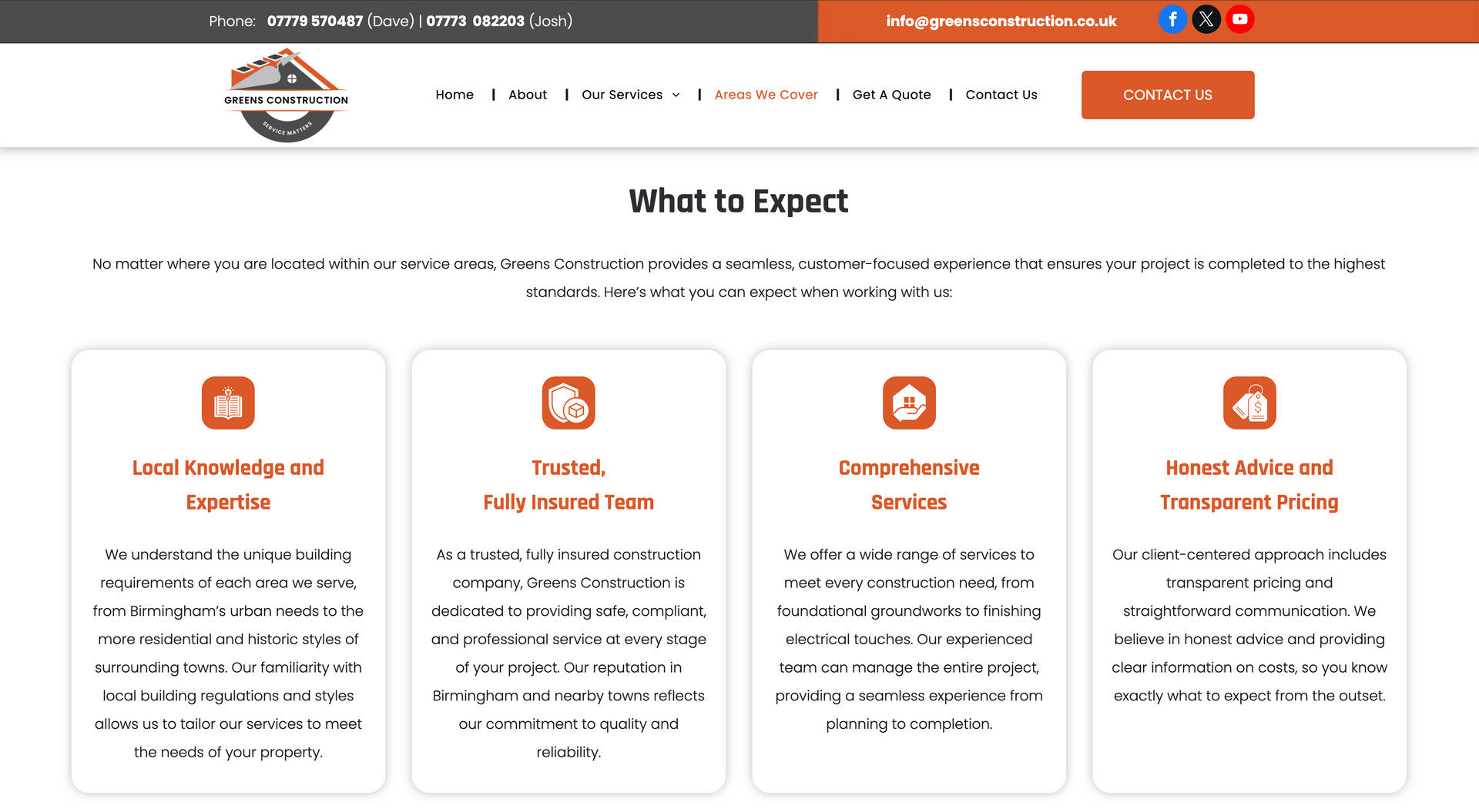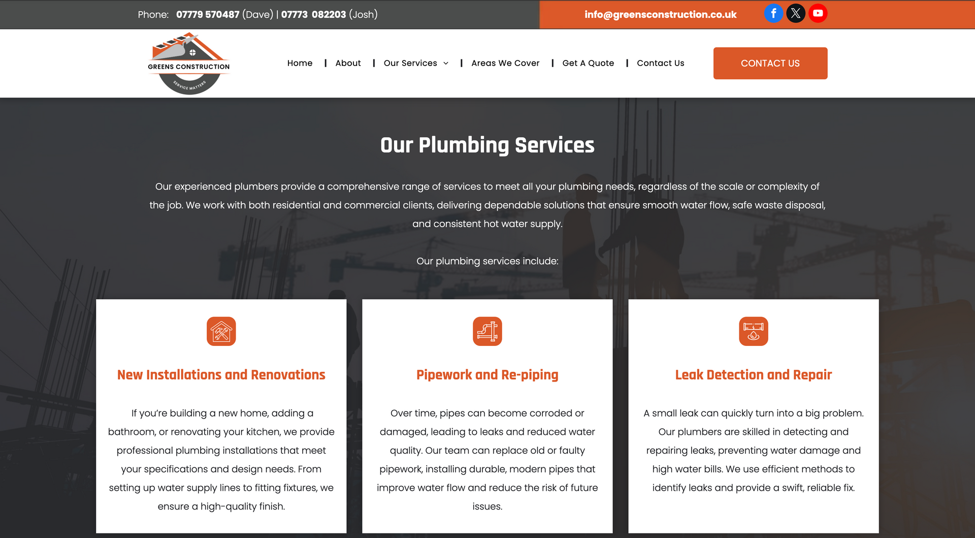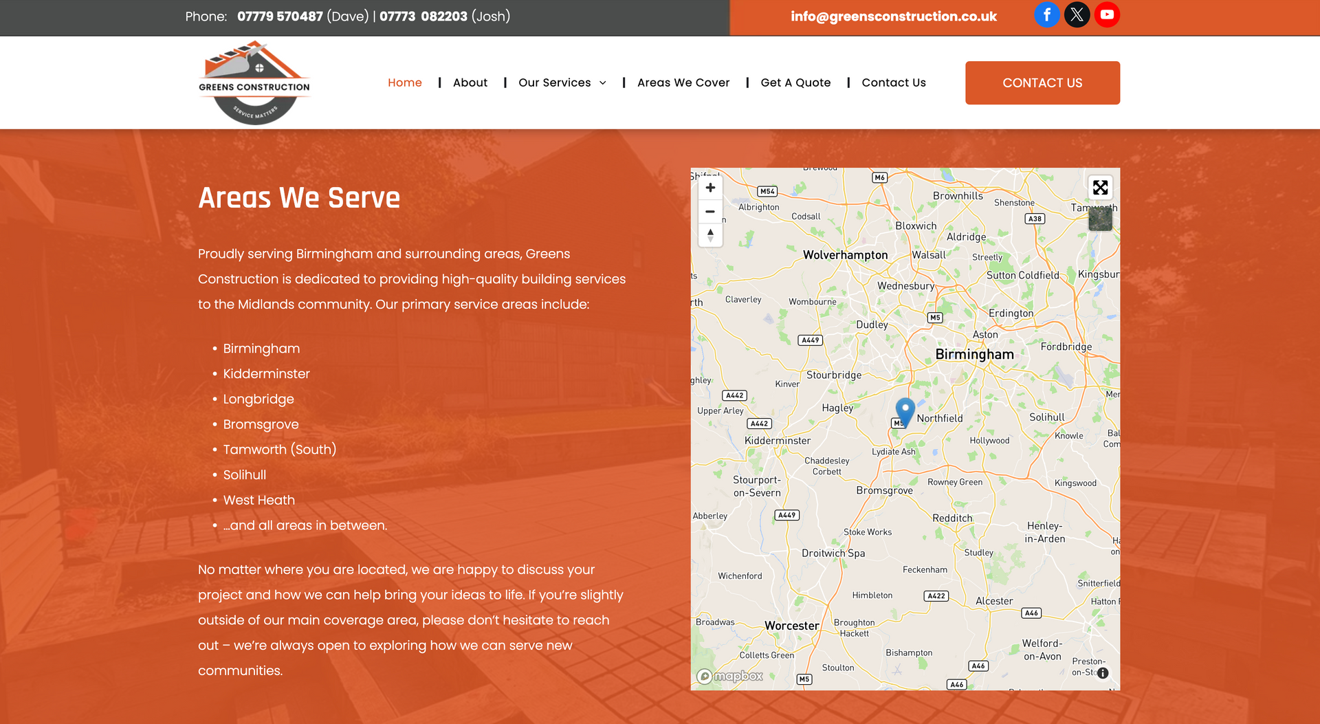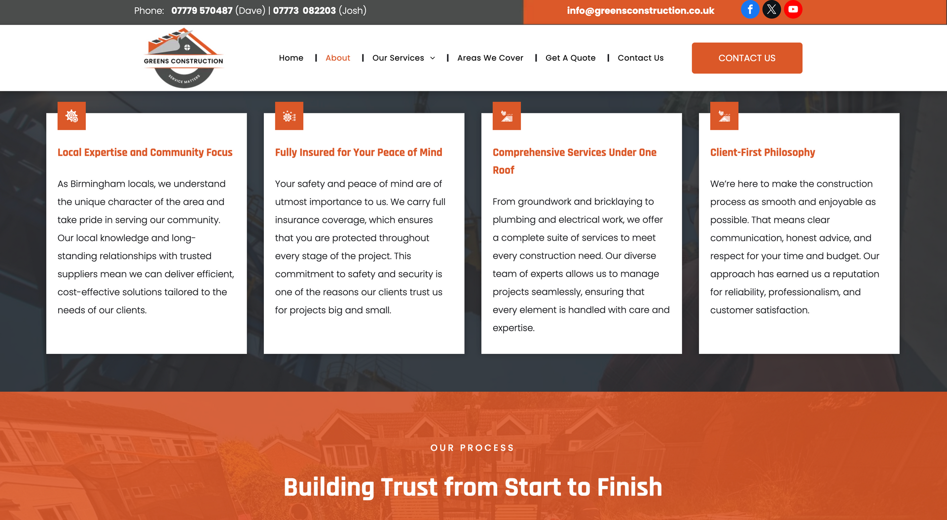 A family run business based in Birmingham, Green Construction covers everything from electrical works to patios. It was important to include a portfolio of previous works as well as showing as many customer reviews as possible to evidence the level of work and customer satisfaction of Green Construction.