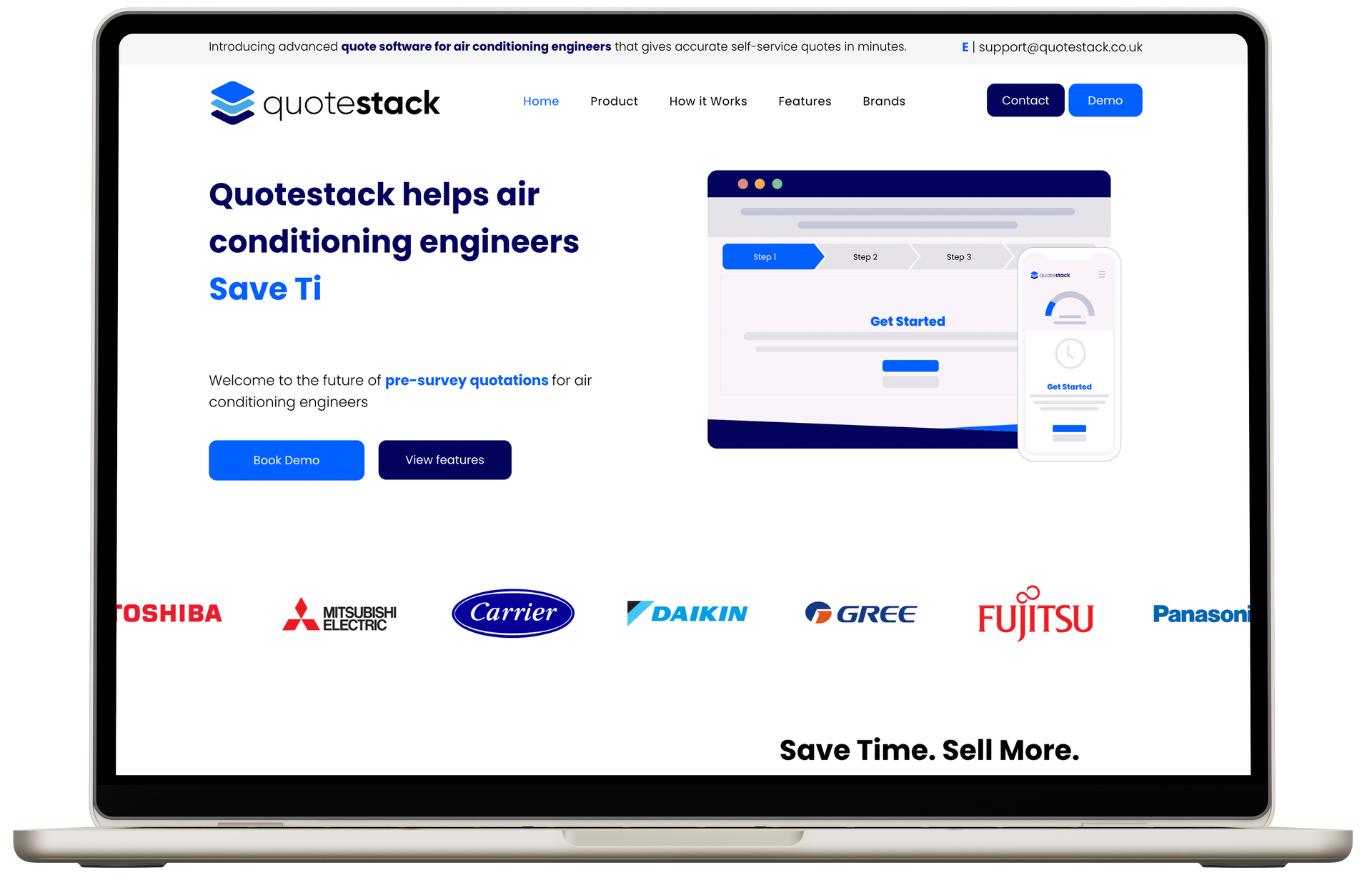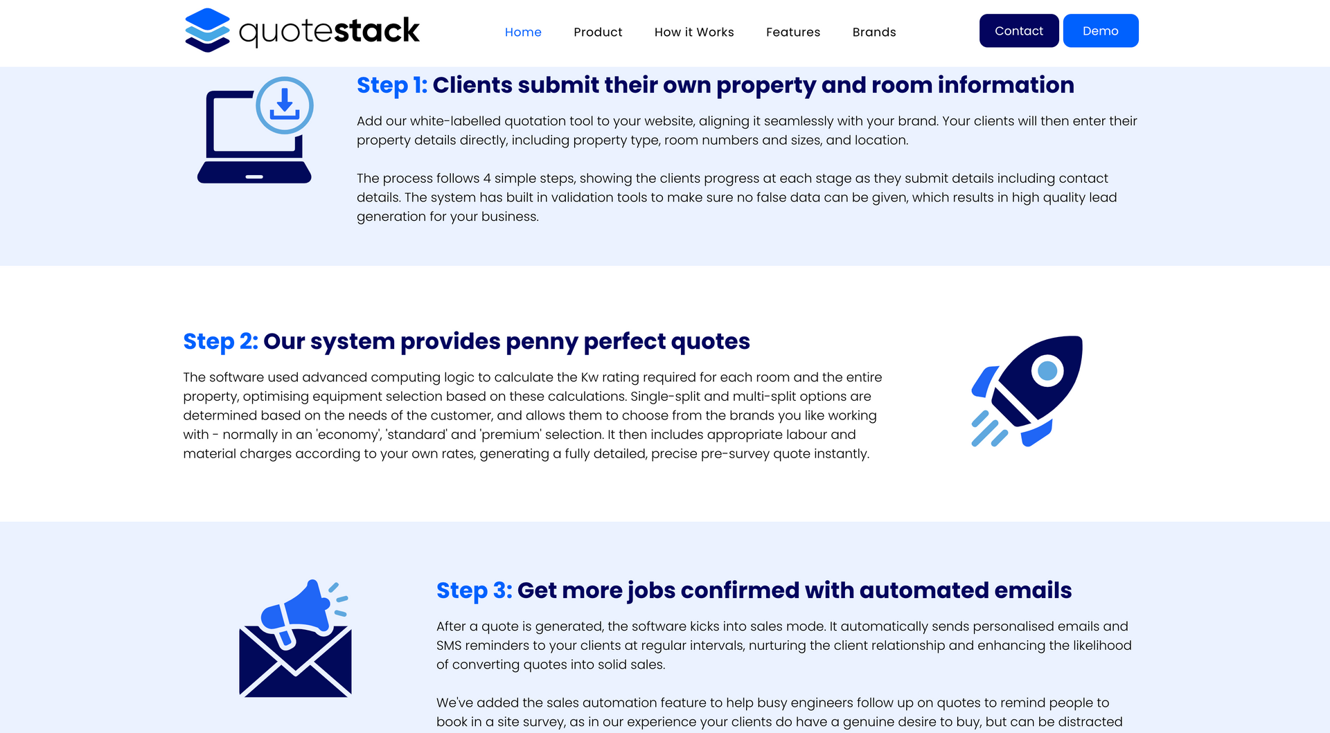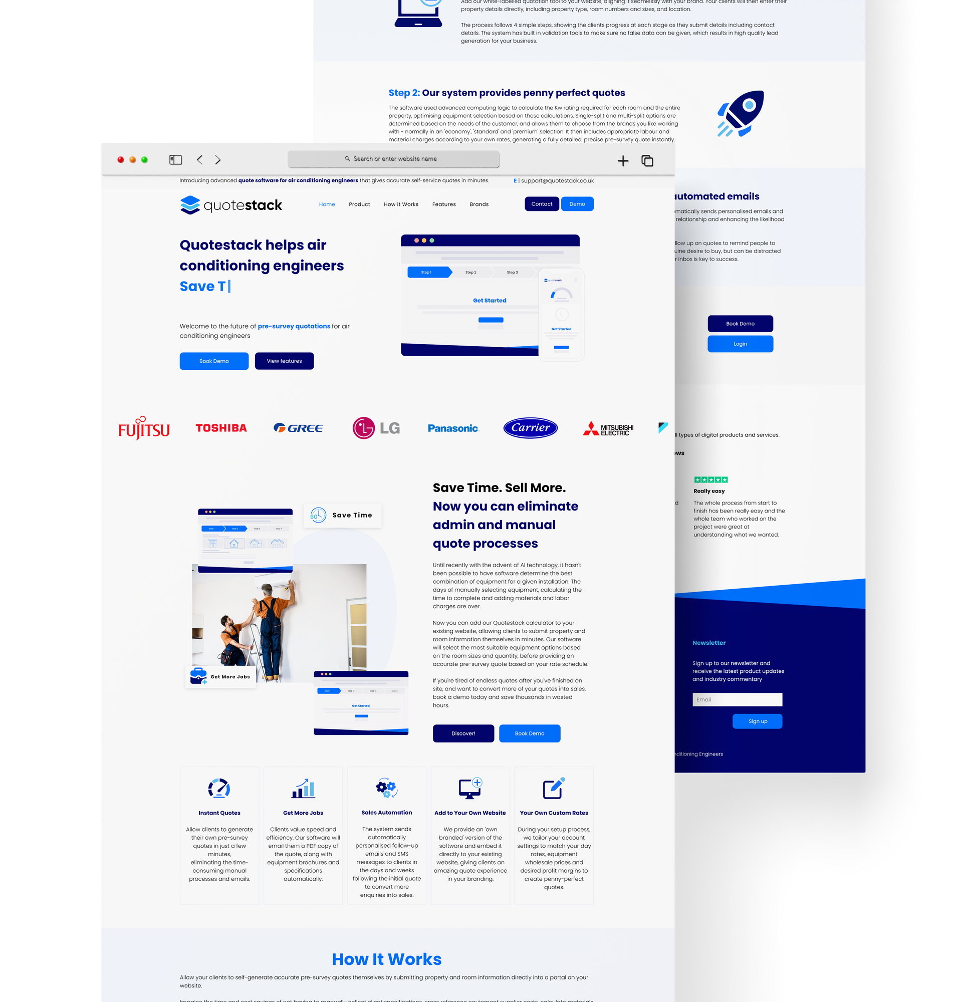 ‘Quote Stack helps air conditioning engineers make more money” - the Qoute stack calculator has been designed using AI to calculate the most efficient and cost effective solutions to air conditioning for a specific property and client. The product here is the calculator, which can be purchased by air conditioning firms and used on their website, allowing the customer to input information and calculating the best possible route and cost of installation, passing this information on to the company. Communicating these steps and the benefits to the client in a clear and concise way was essential for the brand. This was carried out with a step by step guide, uninterrupted by cluttered widgets and pop ups.