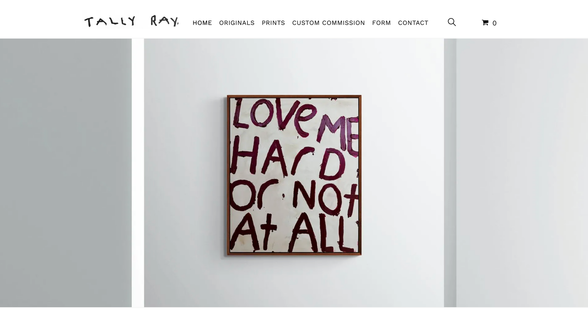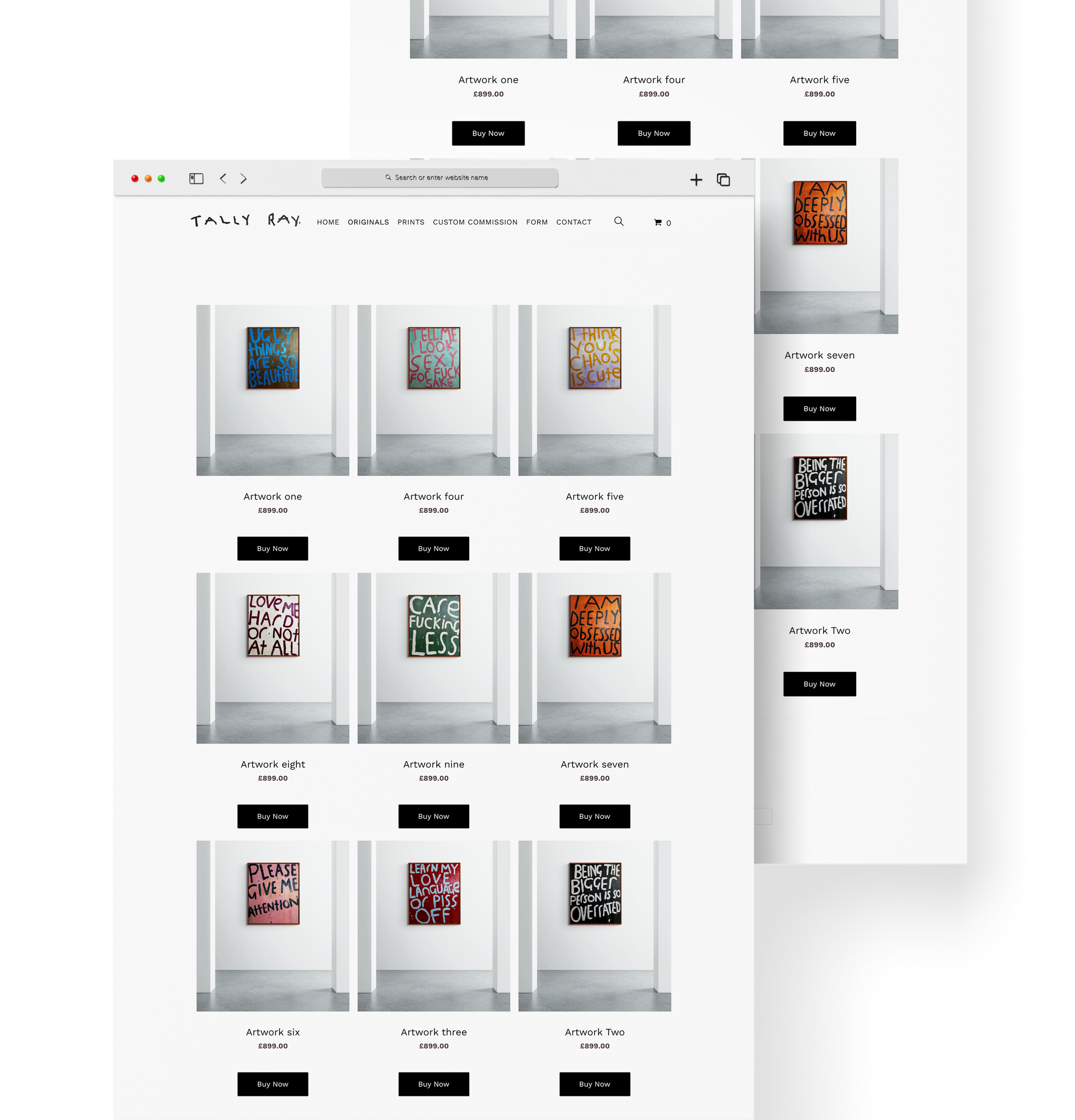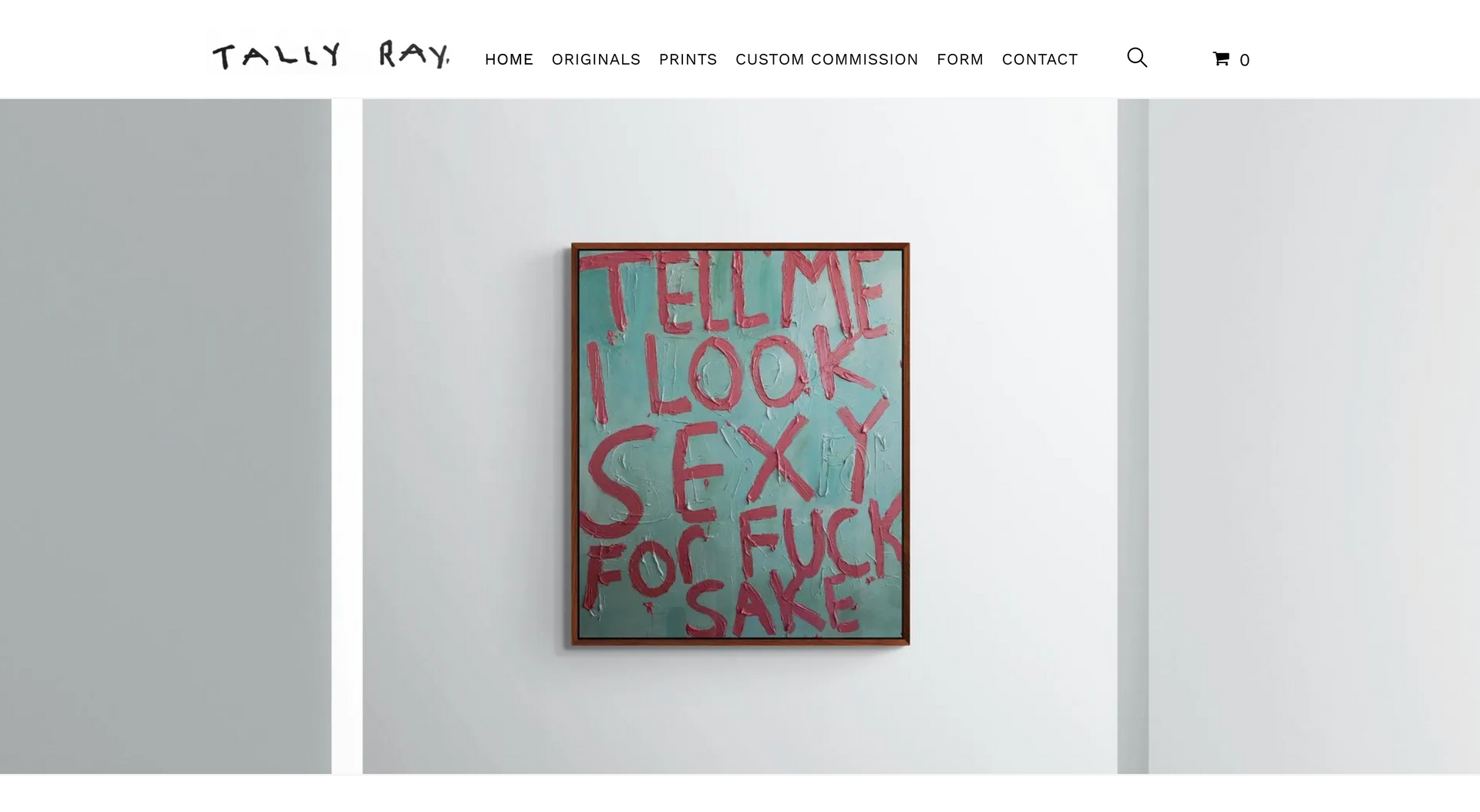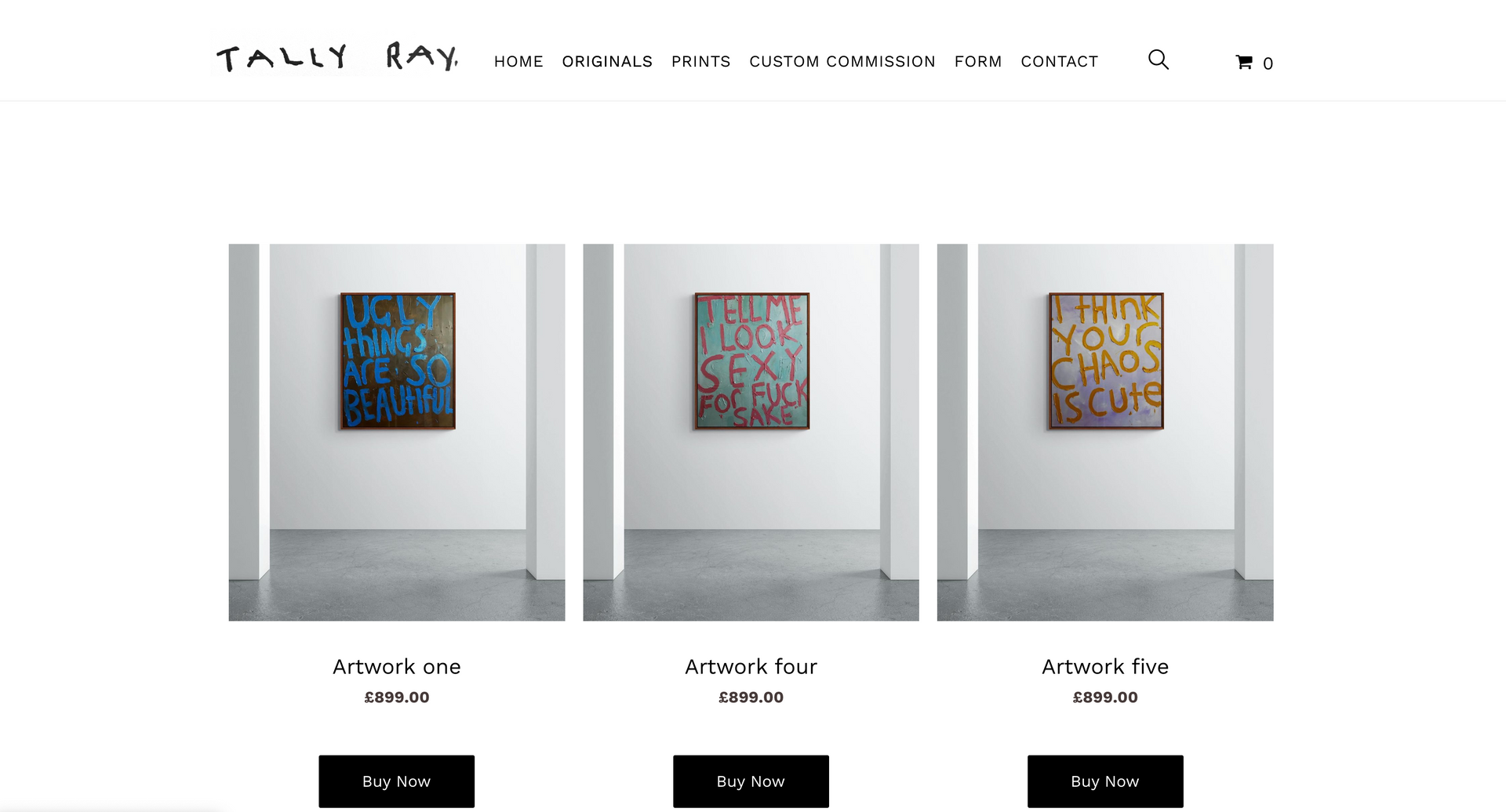Tally Ray is an emerging artist specializing in contextual word art. Creating a website centred around art means being completely image orientated. This starts with creating a page which is image-centric: clean white background paired with minimalist font and text allows the art to speak for itself.