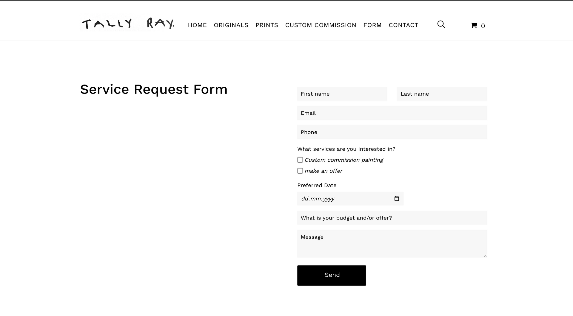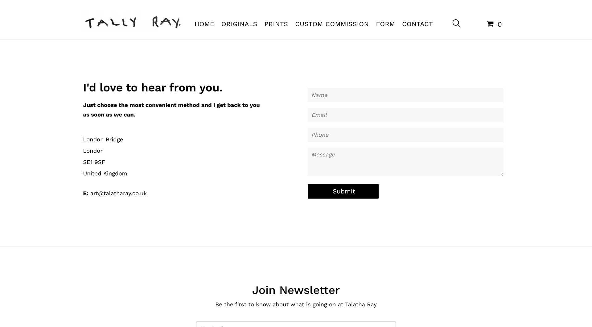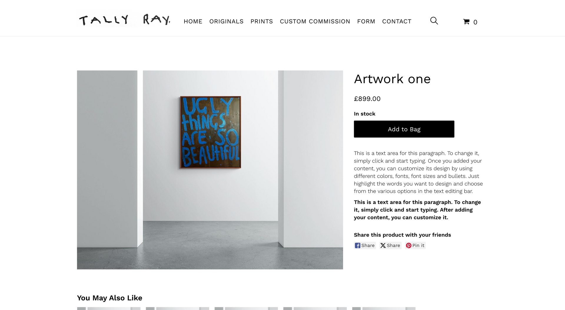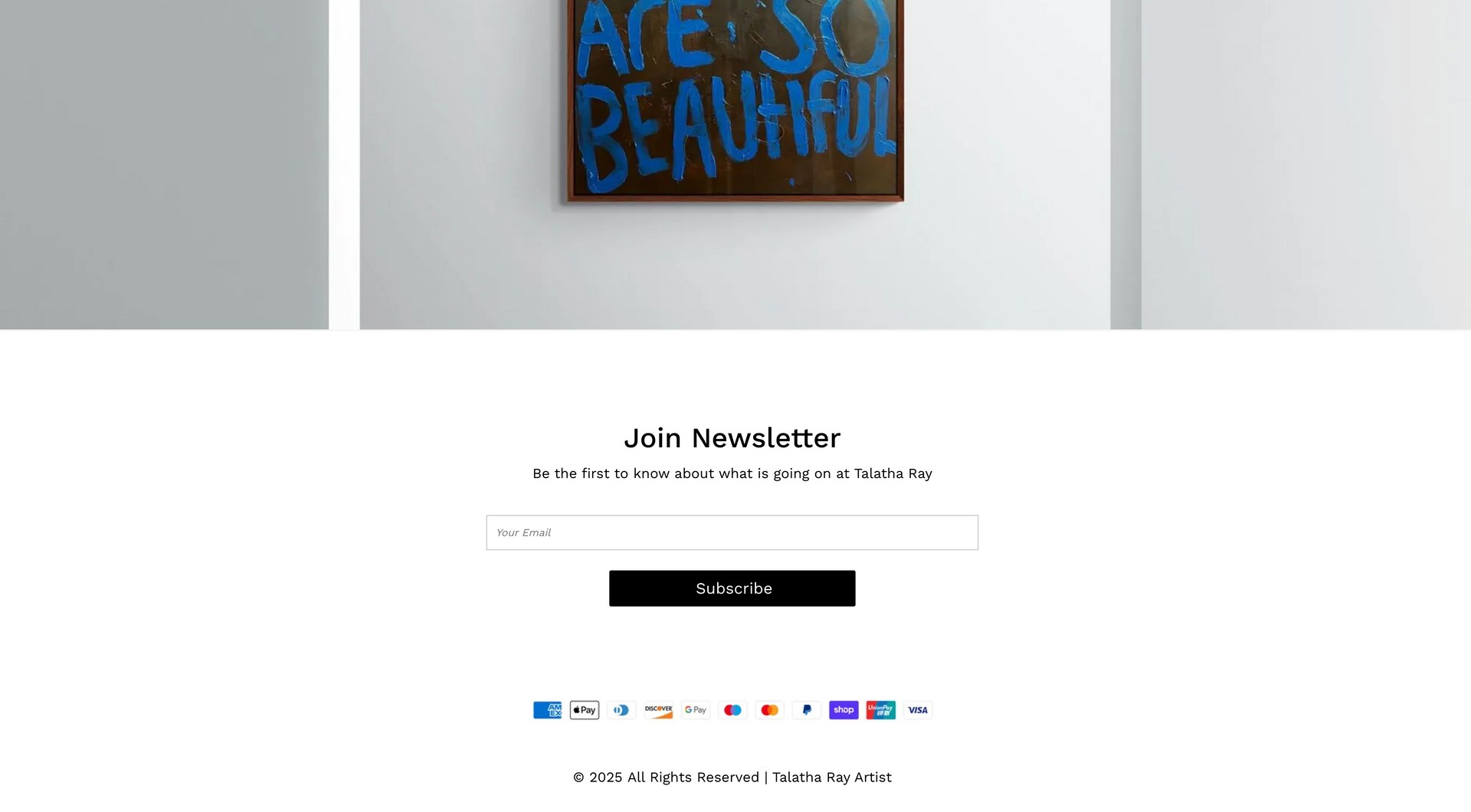 Tally Ray is an emerging artist specializing in contextual word art. Creating a website centred around art means being completely image orientated. This starts with creating a page which is image-centric: clean white background paired with minimalist font and text allows the art to speak for itself.