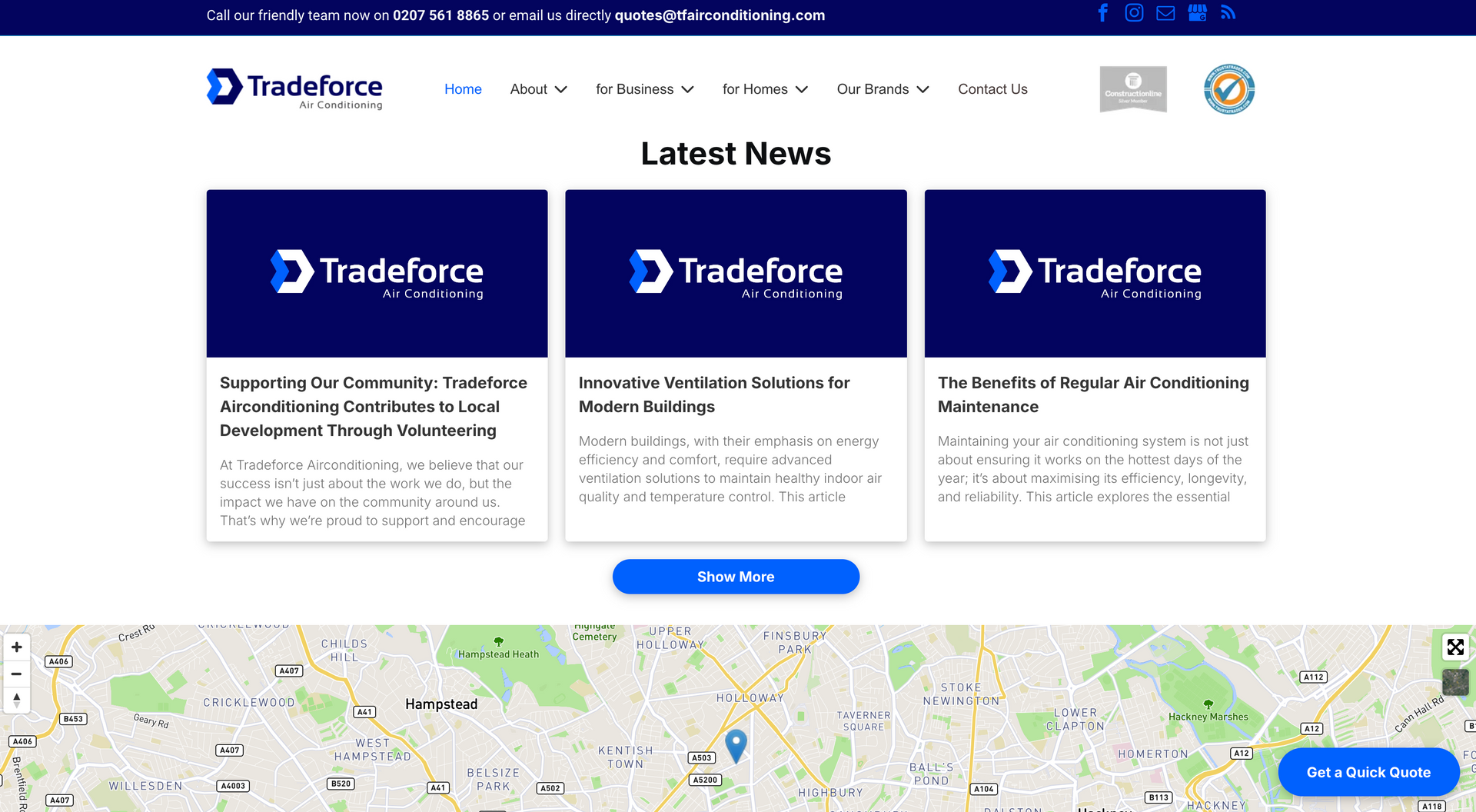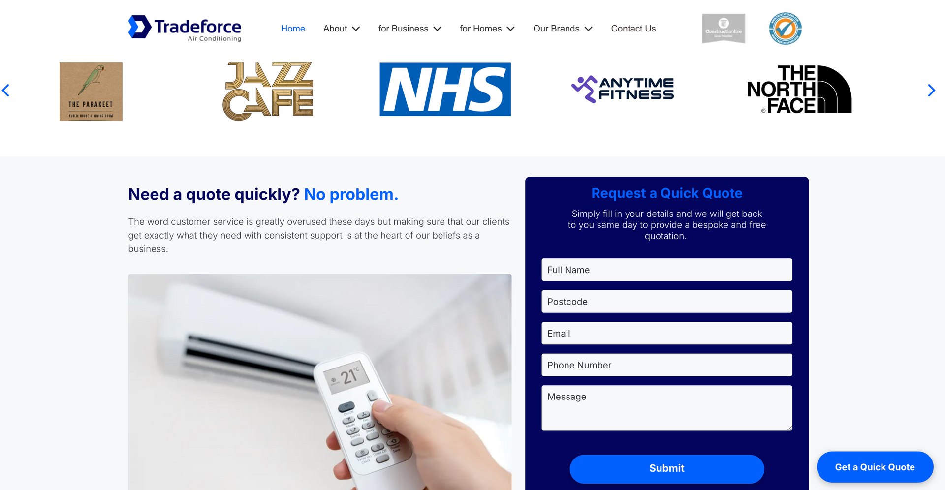 TF Air Conditioning provides air con fitting and maintenance across the UK across domestic and commercial sectors. For the client, a selling point is the variety of household name companies they have worked with, from Mitsubishi to Samsung. It was important to display this on the site alongside the certifications to show the reputability of the company