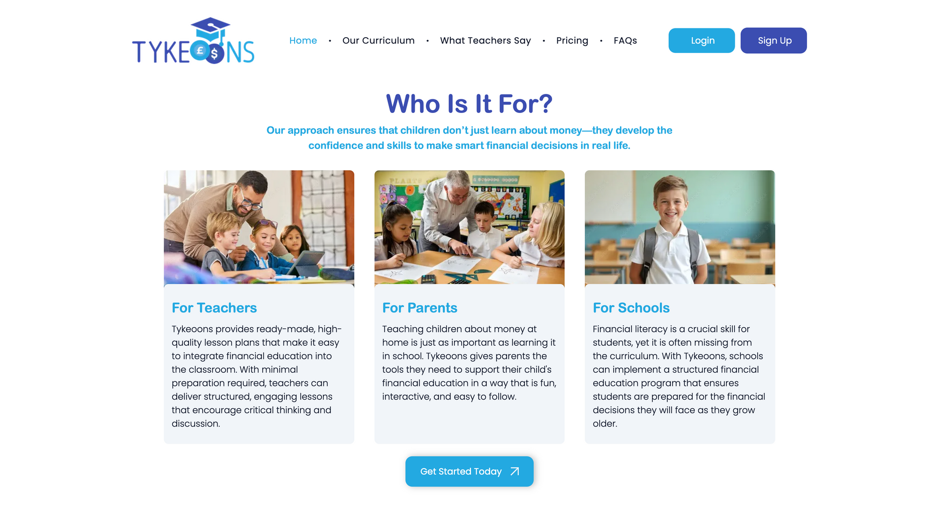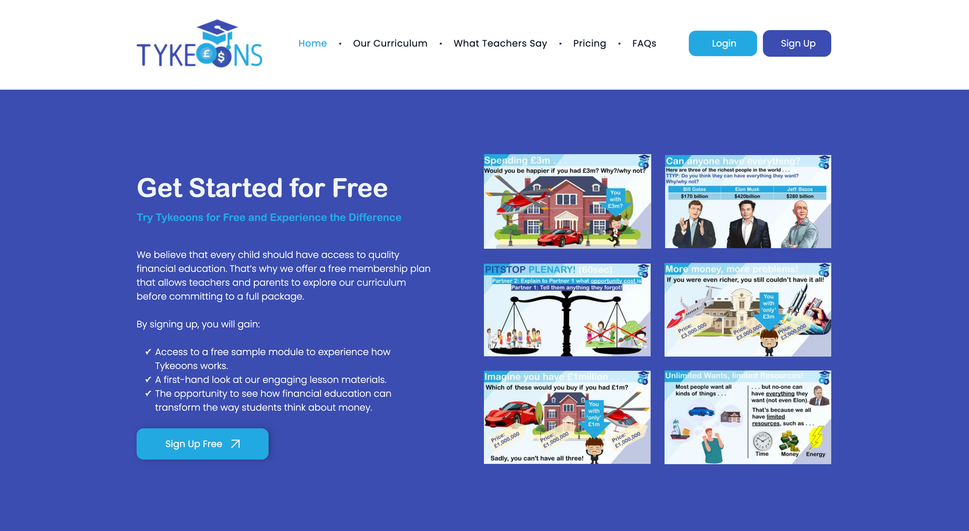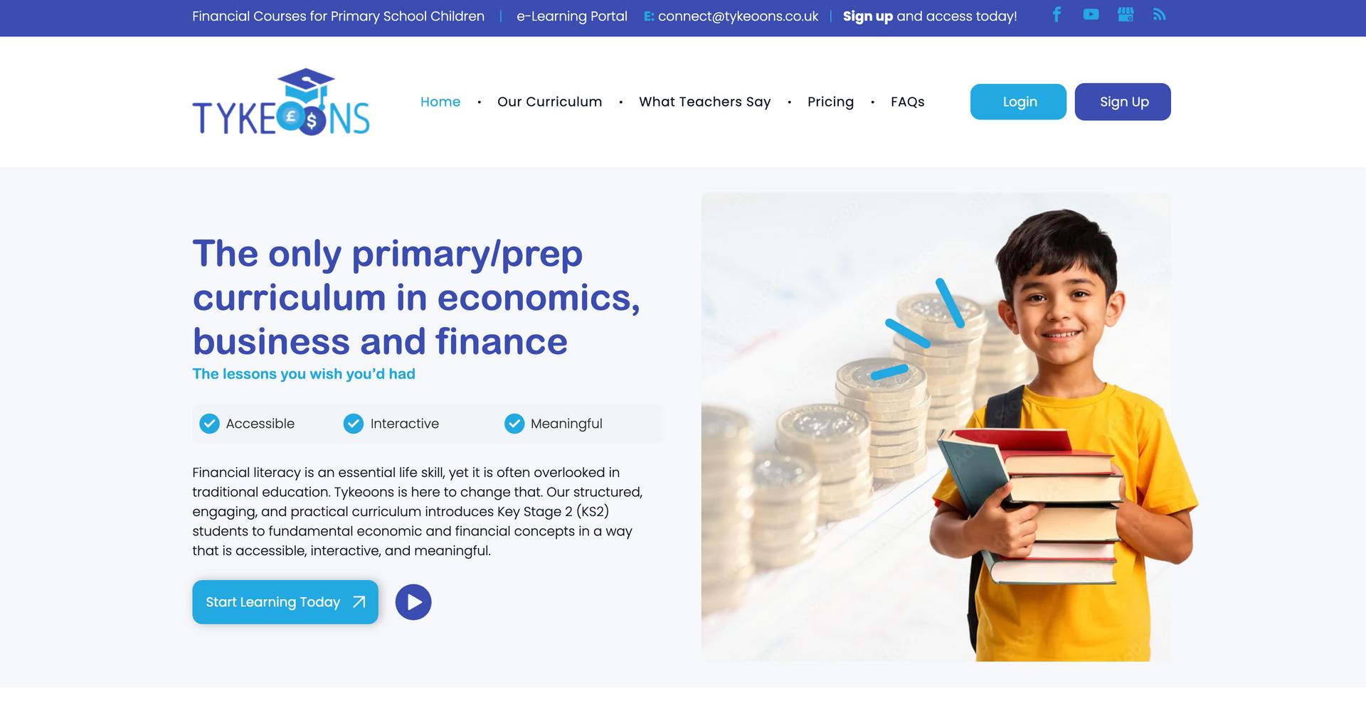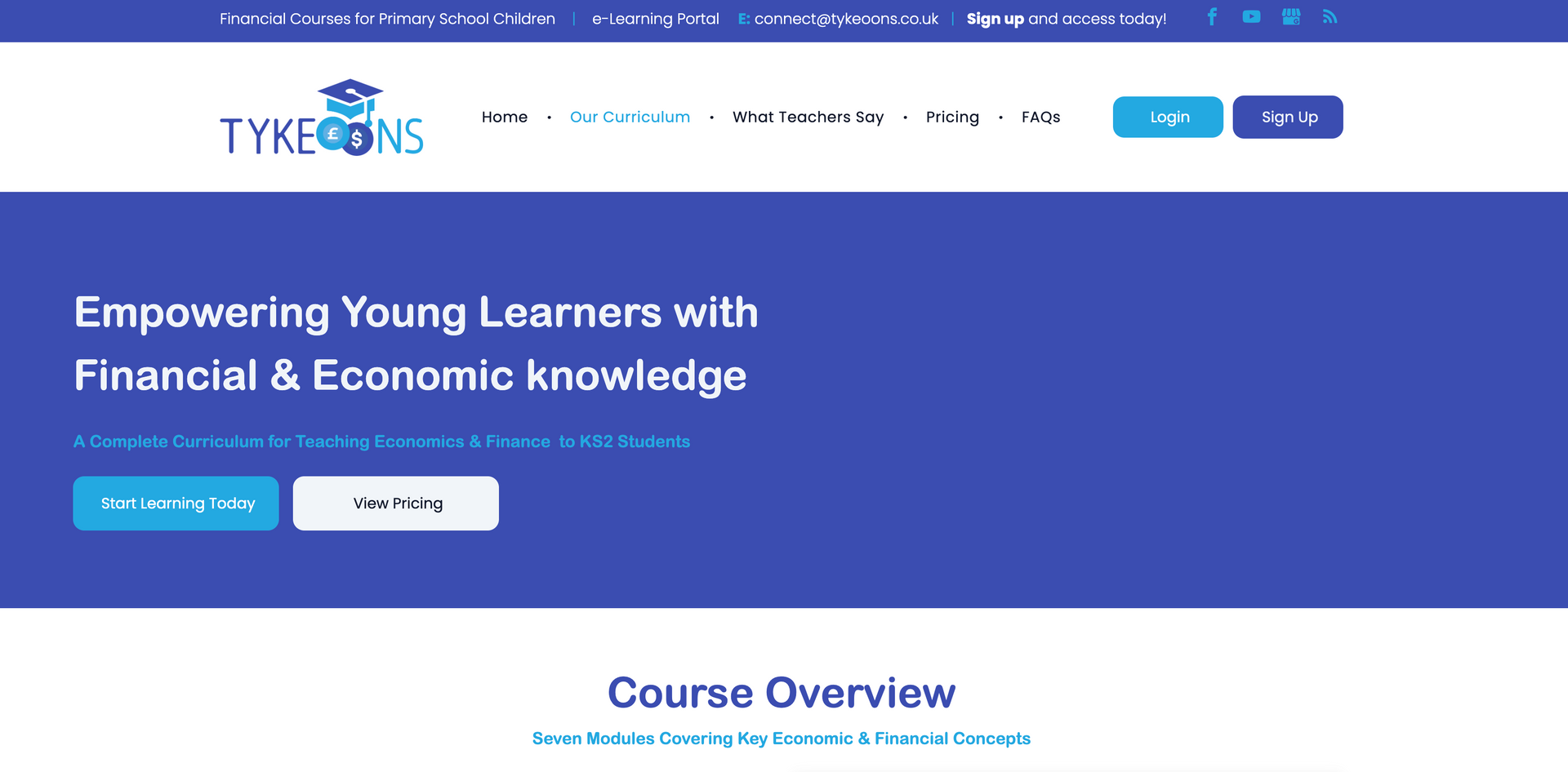 Innovative and forward thinking - Tykeoons offer financial literacy education to primary/prep schools. Designed for years 3-6, Tykeoons makes financial literacy available from a young age, teaching children about financial decisions from a young age. As designed in the interest of schools and parents, the website had to fit in with that of a school, to emulate this, soft colours and fonts have been used. To build trust, a step by step of ‘how it works’ is included in the website as well as a sample lesson being available to send when you sign up.