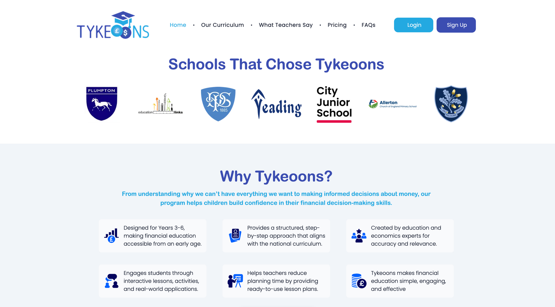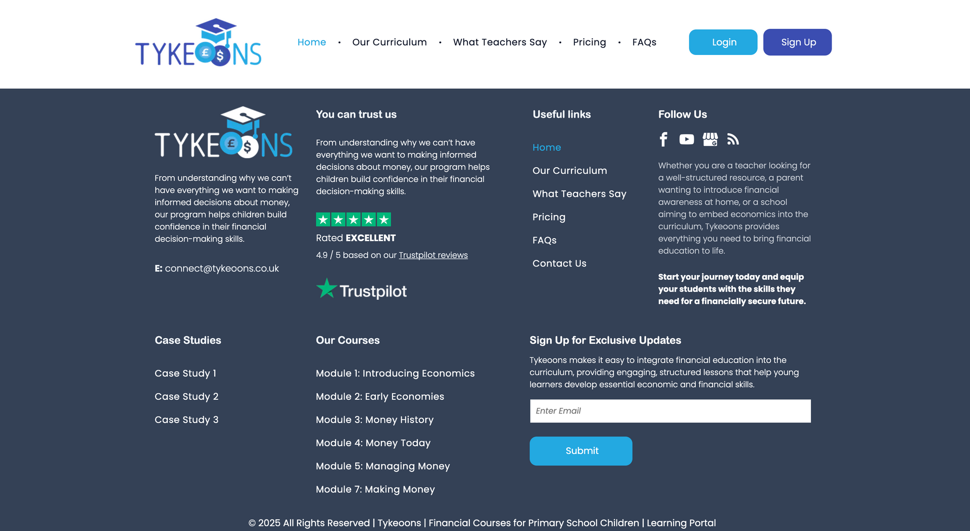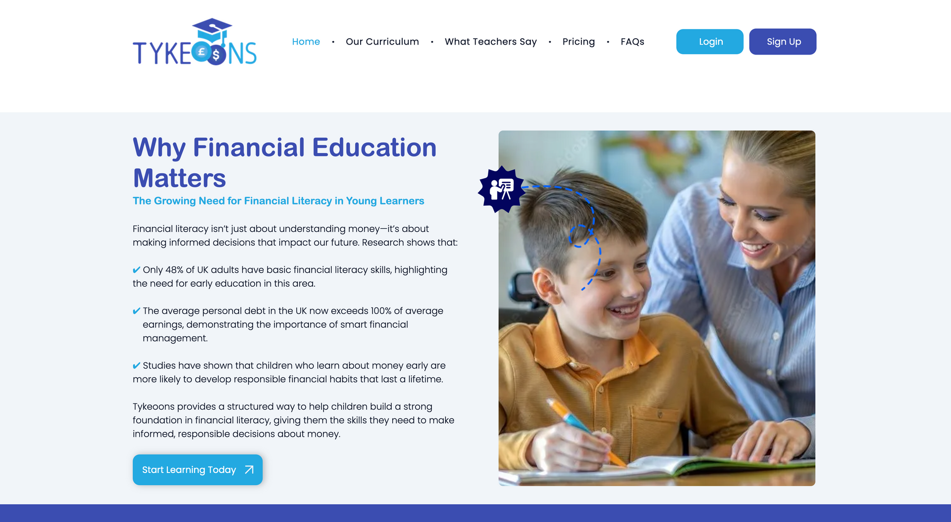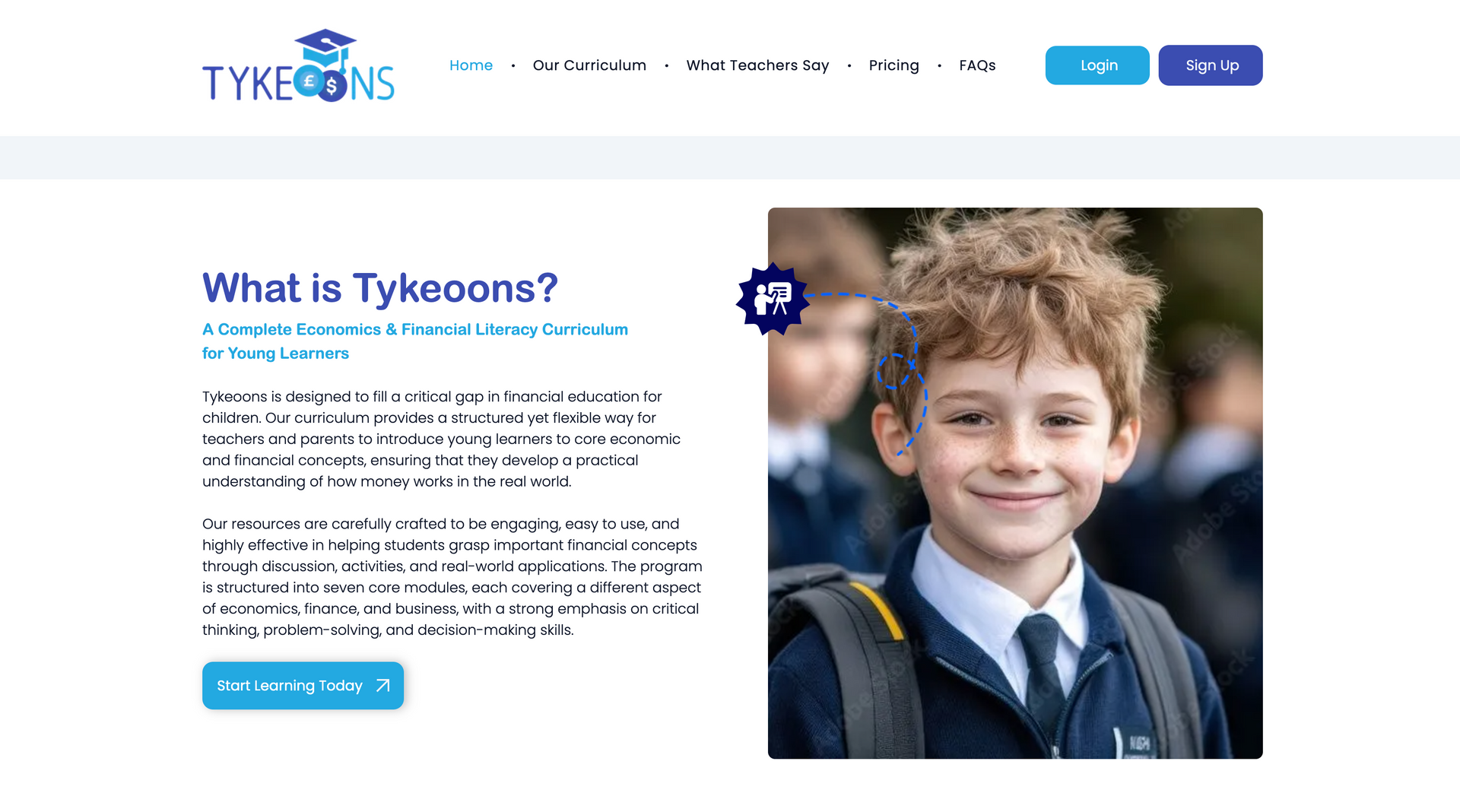 Innovative and forward thinking - Tykeoons offer financial literacy education to primary/prep schools. Designed for years 3-6, Tykeoons makes financial literacy available from a young age, teaching children about financial decisions from a young age. As designed in the interest of schools and parents, the website had to fit in with that of a school, to emulate this, soft colours and fonts have been used. To build trust, a step by step of ‘how it works’ is included in the website as well as a sample lesson being available to send when you sign up.