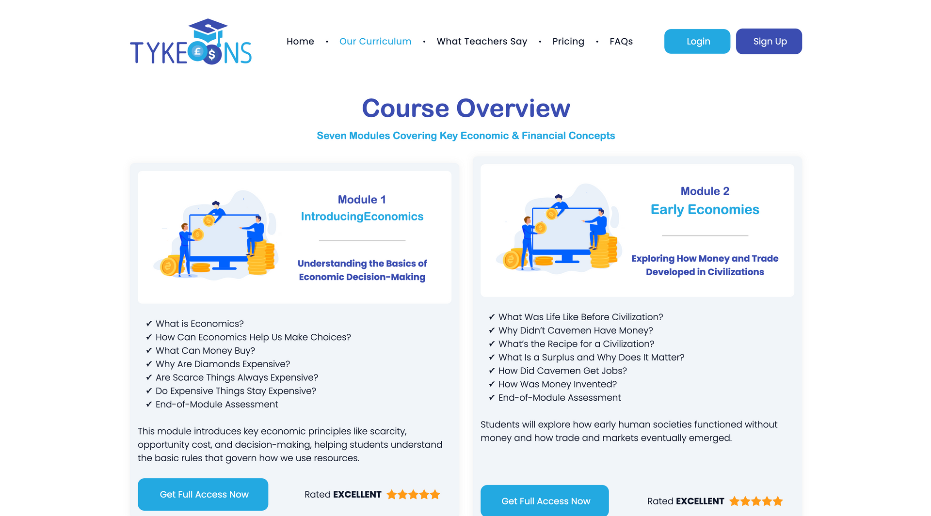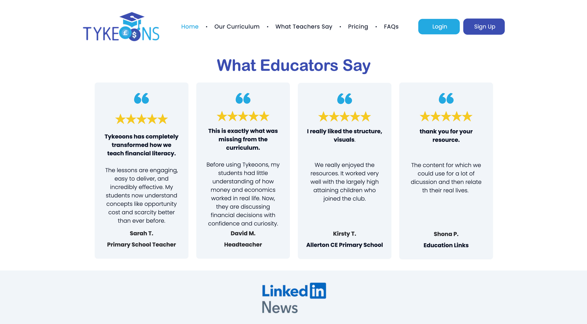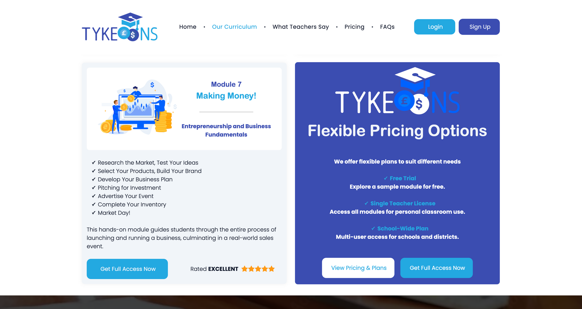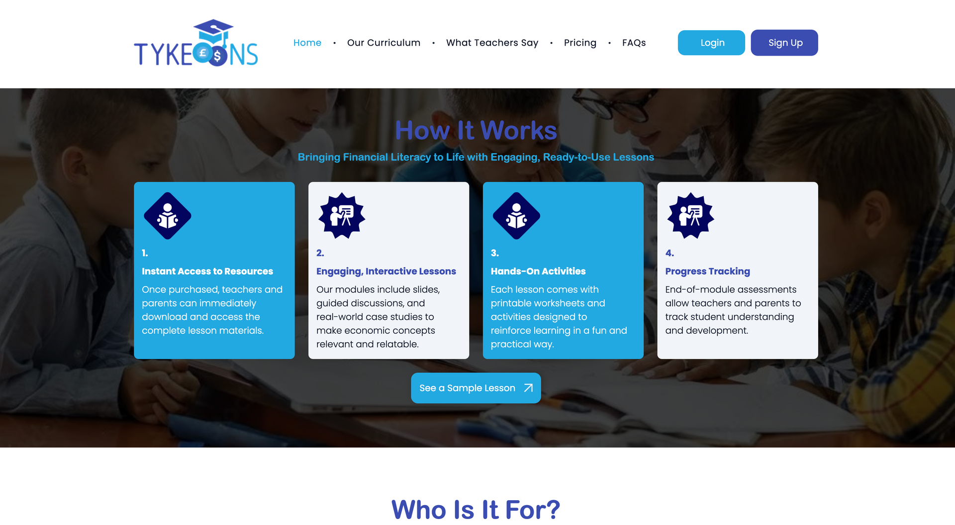 Innovative and forward thinking - Tykeoons offer financial literacy education to primary/prep schools. Designed for years 3-6, Tykeoons makes financial literacy available from a young age, teaching children about financial decisions from a young age. As designed in the interest of schools and parents, the website had to fit in with that of a school, to emulate this, soft colours and fonts have been used. To build trust, a step by step of ‘how it works’ is included in the website as well as a sample lesson being available to send when you sign up.
